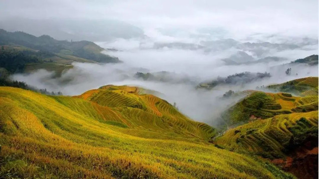 在一片片缥缈的洁白云雾中,极目远眺,一座座大山上蜿蜒起伏的梯田,静如止水,精美绝伦。