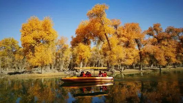 新疆轮台胡杨林是中国最美的十大森林之一,大面积的胡杨林与河流、沙漠、戈壁、绿洲、沙漠、古道及荒漠草原融为一体。