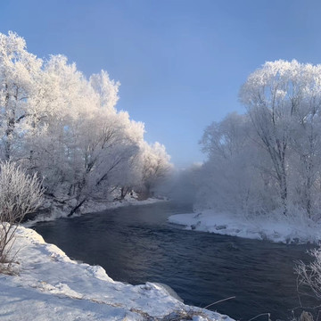 雾凇之美,美在壮观,美在奇绝。放眼望去,遍山皆雪,漫天皆白。大自然用雾作原料,用风作笔,把天地万物绘成一个晶莹剔透的世界。在阳光照耀下,一切仿若琉璃初成,冰清玉洁中有流转的光华。蓝天寂寂,瑞雪轻铺,满山的玉树琼枝像经过了加工的冰雕。