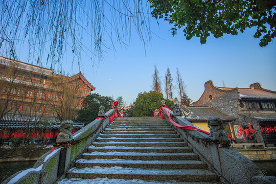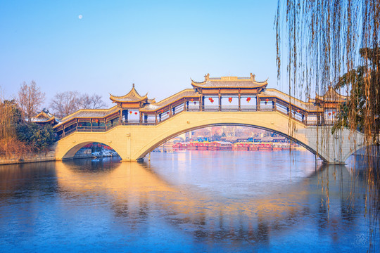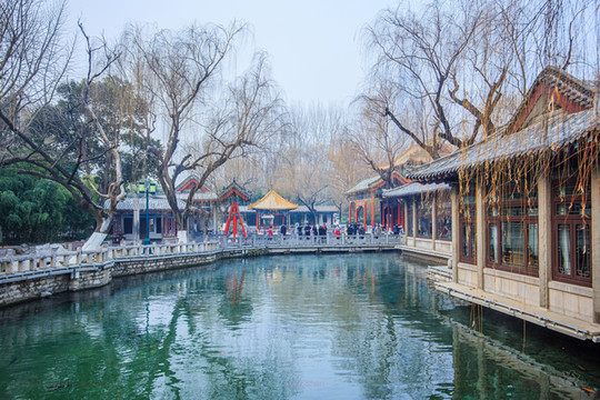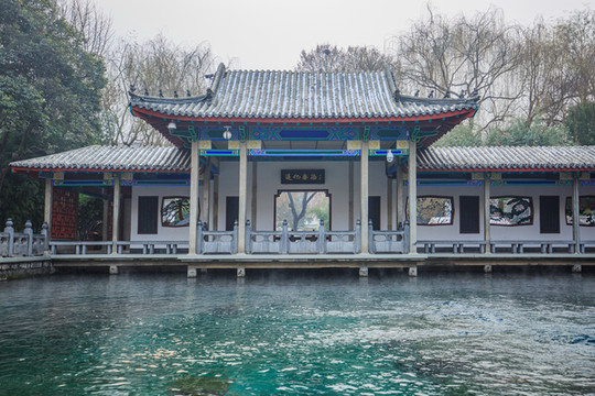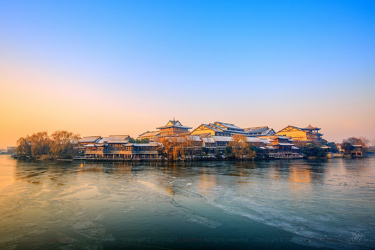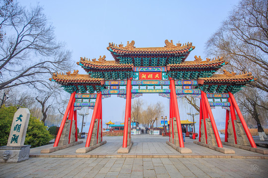 如镜的水,枯柳残荷,加上几座朱梁画栋的楼阁,自成格调。冬日的大明湖虽不见碧波荡漾,但显得格外明净。
