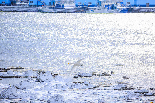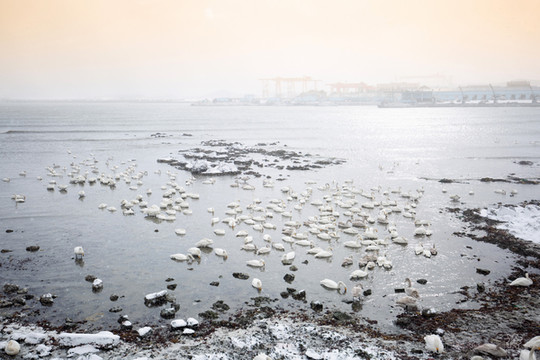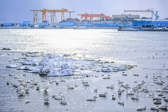 停下车后转了一圈,并没有见到传说中的天鹅湖,难道开错地方了吗?好在随着阵阵的天鹅叫声朝着海的方向走去,来的早不如来得巧,刚好遇到工作人员给天鹅喂食,成百上千从西伯利亚到此过冬的天鹅聚集在眼前,这个画面其实还是非常壮观的,据说原本这里只是一个普通的海湾,因为偶尔迷路的天鹅到此停留歇息,当地好心人给天鹅喂食,一传十十传百,成为更多的天鹅过冬的选择,原来天鹅之间也有做宣传的,实在是很接地气。