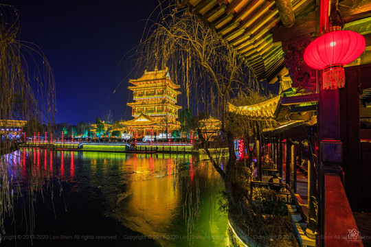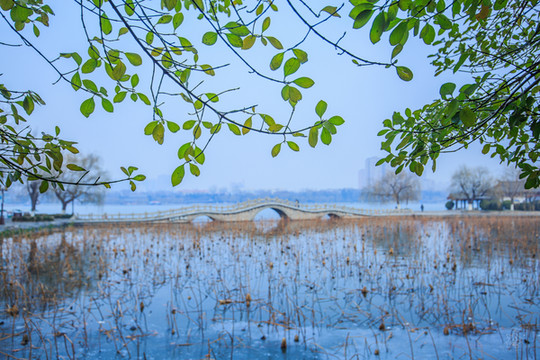 站在楼顶平台上,远眺近观,波光粼粼,湖水如镜,杨柳依依,树影婆娑,楼桥如画。在残荷的映衬下,在日光和阴影的层次里,展现冬日别有的魅力。