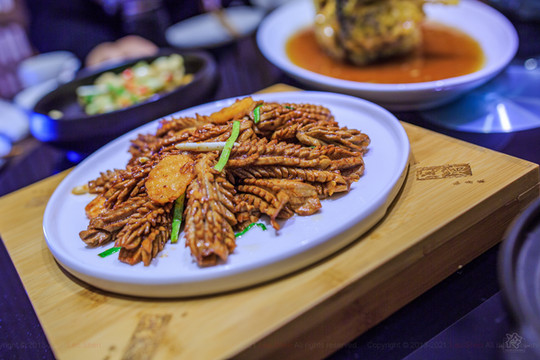 相较于之前来威海吃的全“刺身”宴而言,私房菜的菜品质量和摆盘精致了许多,甚至还出现了久违的大海星,这道菜这么多年来对于我而言始终是属于敢看不敢尝的地位,胆子大的小伙伴还是勇敢的尝试了一下,口味吗“据说是很像比较干的蟹黄味道”,至于实际的口感吗,各位有机会还是自己亲自尝试吧,只可意会不可言传。