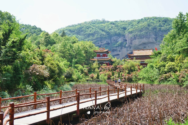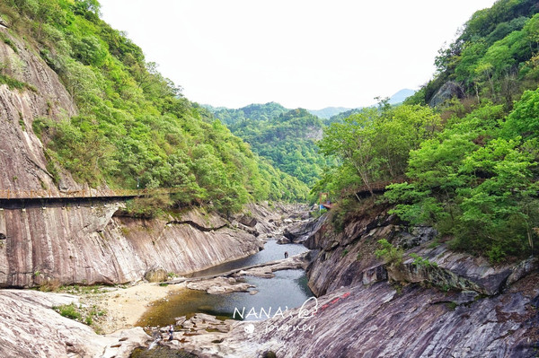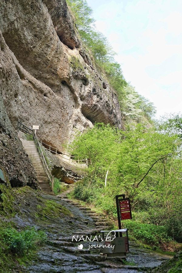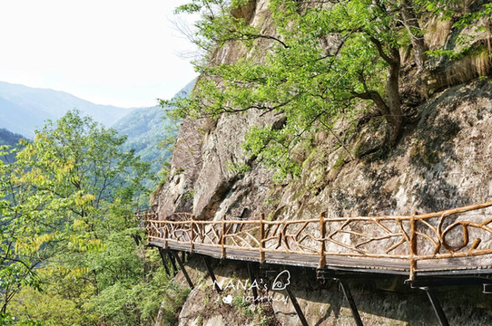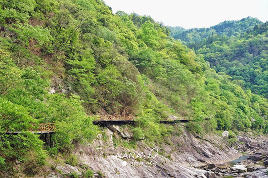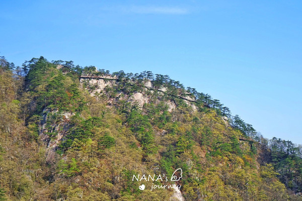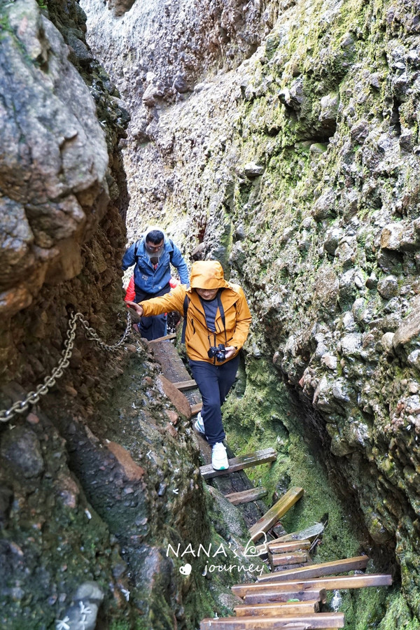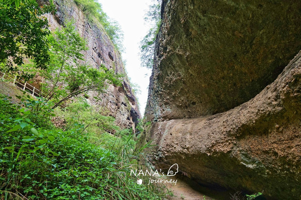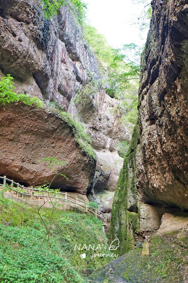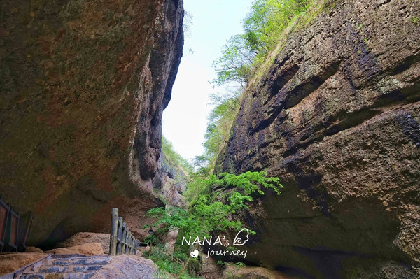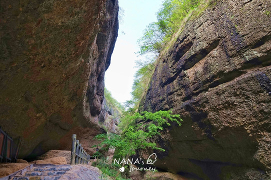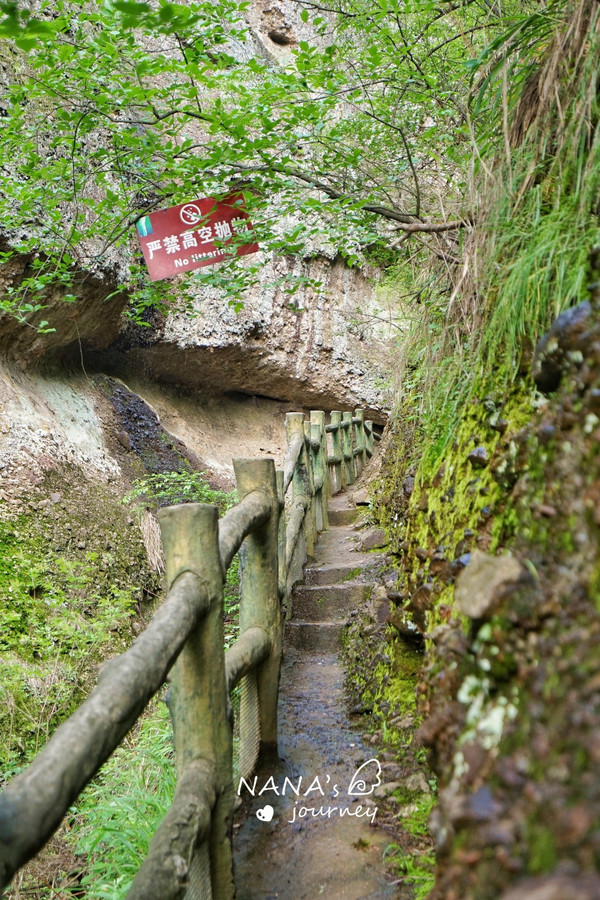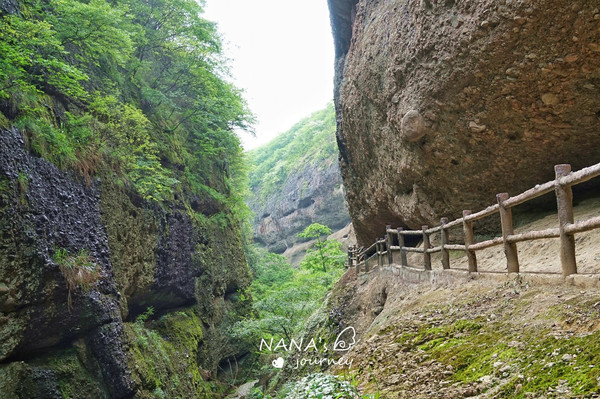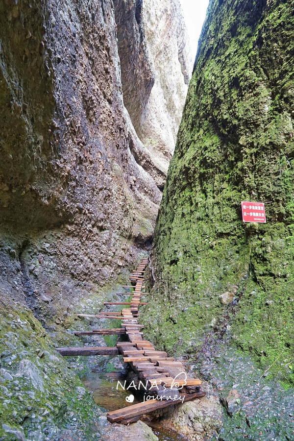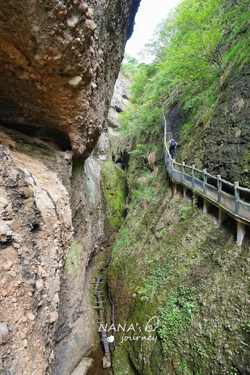 仔细观察这峡谷两侧,和以往去的峡谷不同的是,光滑的整块石壁上腾空建着栈道,深入峡谷之中,绿色植物仿佛只是点缀