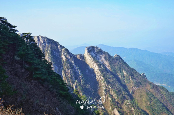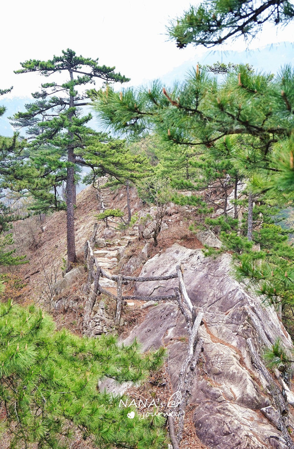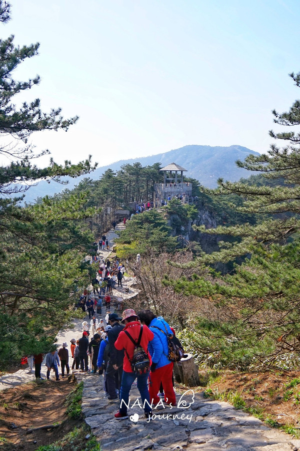 经过将近1个半小时的努力攀登,我们来到了第一个观景点,也是如同一个宽版鲤鱼背的巨石,顶上大石交错,或上或下,怪松奇石都是 大别山 主峰最独特的看点。