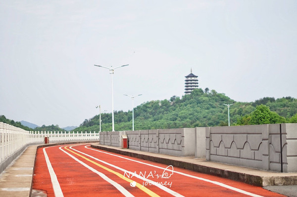 坐着景区小电瓶车,很快到了水库的大坝上,这里便是万佛湖的起点了。为了增加趣味,大坝上是一条彩色跑道,可以散步赏湖景,也可以跑个步锻炼身体,毕竟这里空气非常的好,水质也是超干净的标准。