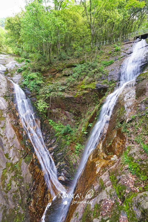 谷内出现在我们面前的第一个大瀑布便是双人瀑了,两挂瀑布在此交汇,巨大的落差,在底潭相遇,仿佛倒着的人字形
