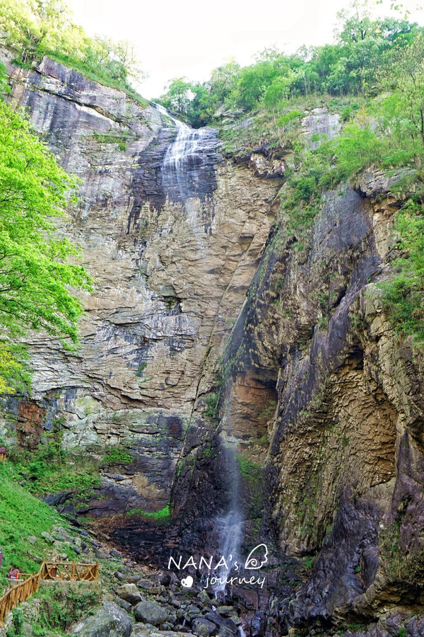 下到平台观赏,便没了上方的那种羞涩感,也看上去比较矮小的瀑布了。
