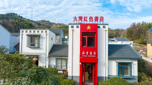临街一栋小楼的白墙上豁然镶出一道红边,屋顶上竖着一个招牌:“ 大湾 红色书店”,上下两层楼里,图书种类繁多。