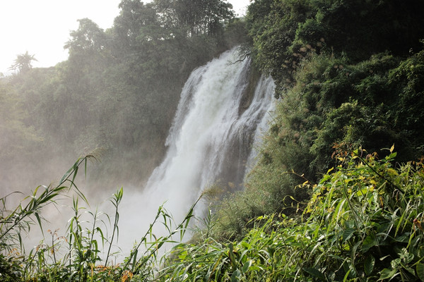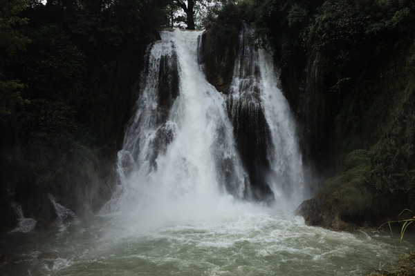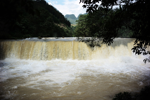 第二天仔细观察八宝镇,发现并没象网上宣传的那样出现小桂林。只不过有条小河穿镇而过(而有重型卡车也不断地穿镇而过)。而整个镇子破旧脏乱。早饭后叫了一辆摩的赶往唯一的景点:三腊瀑布。经过20多公里翻江倒海的颠簸乡道(我第一次看见官方的路牌写着:乡道),来到一个村子后院的小瀑布 - 三腊瀑布,还要收20元的进村观赏费,还有许多自驾车赶来观赏!