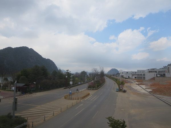 再往外,是公路,横跨公路的,是普者黑景区的标志性城楼。