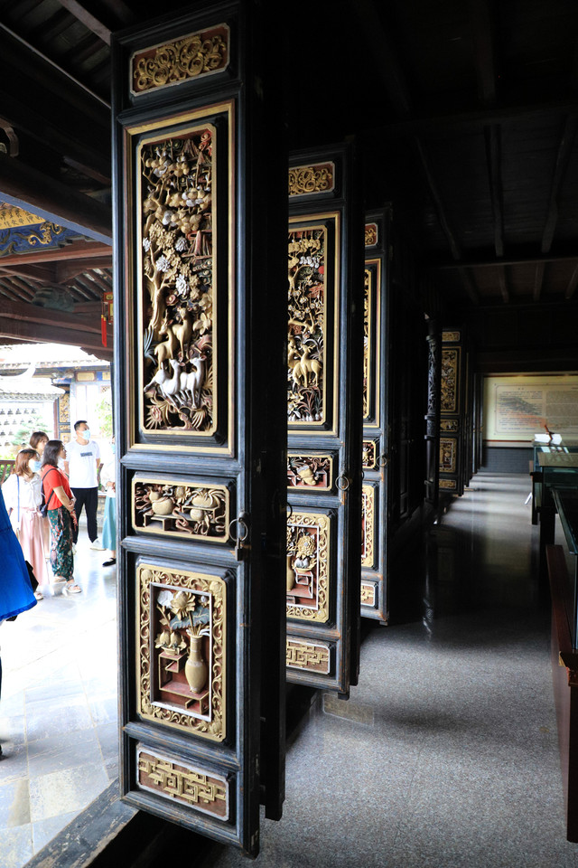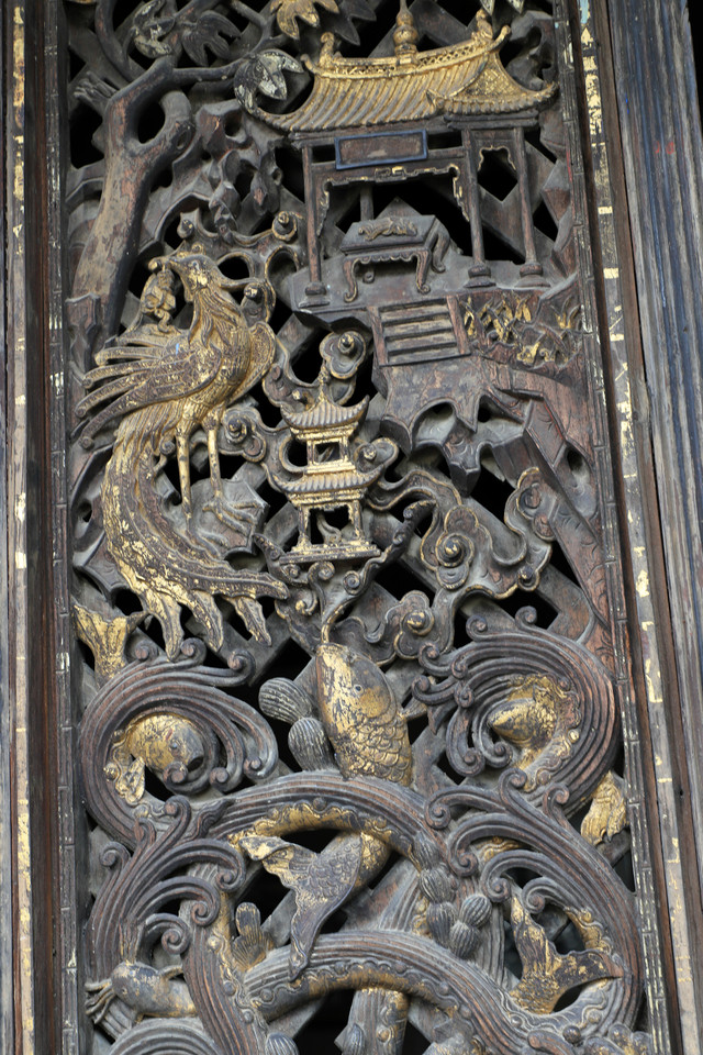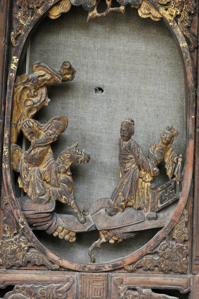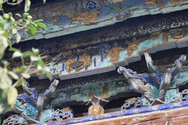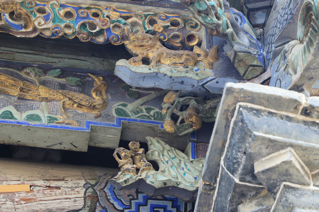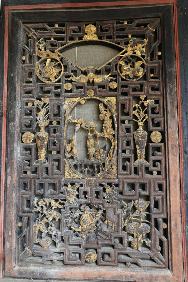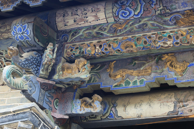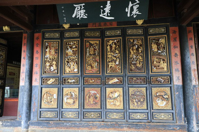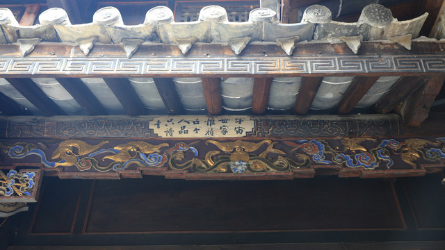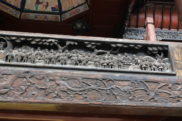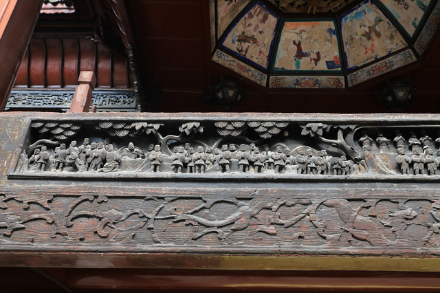 祠堂横梁装饰雕梁画栋,庄重典雅,题材是中国古典的三国演义、水浒传等精彩故事
