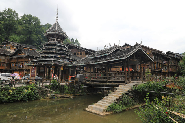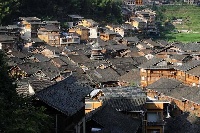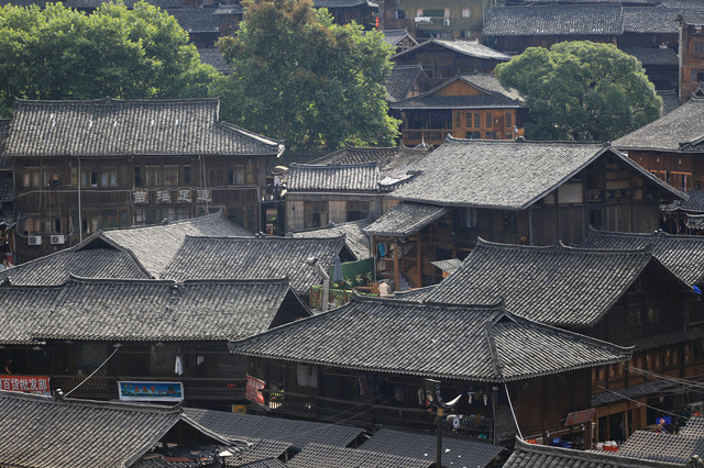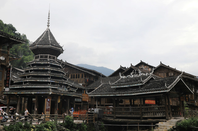 苗寨的建筑以木质的吊脚楼为主,为穿斗式歇山顶结构
