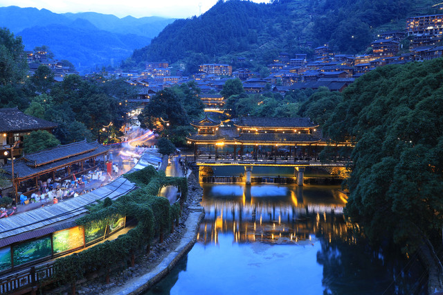 到了黄昏时分,风雨桥亮起了灯,随着天色越来越暗,千家万户都亮起了灯,西江千户苗寨就变成了灯的海洋