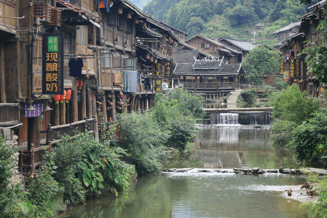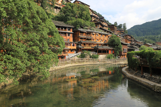 西江千户苗寨所在地形为典型河流谷地,清澈见底的白水河穿寨而过,千百年来,西江苗族同胞在这里日出而耕,日落而息。
