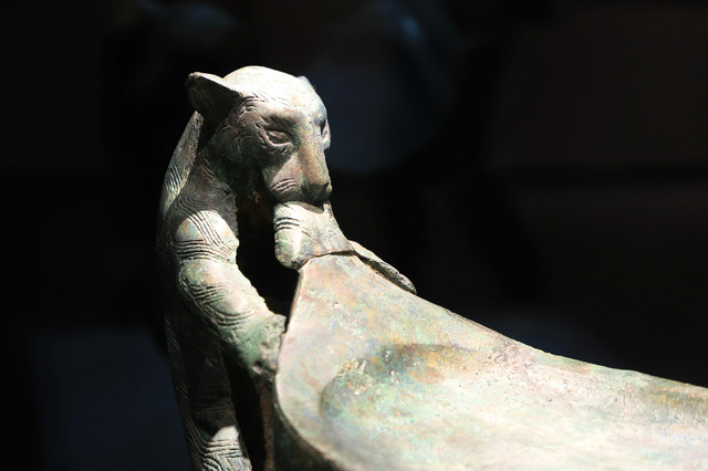 大牛与小虎用模铸造,一次成型,小牛则另铸再焊接于大牛腹下。作为滇国的一件祭器,牛虎铜案在力学和美学上都达到了极高水平,几近完美。
