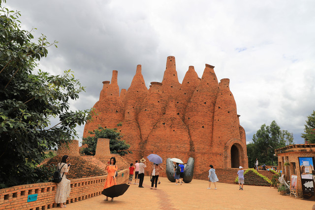 景区的建筑都是以本地生产的红砖为主,十分具有设计感。据说景区内部建筑连草稿都没有,随心而动。这样一个看似毫无章法的建筑,出自一位出生于弥勒的“奇人”之手,他将三种当地的文化混合其中,酒瓶状建筑代表的是弥勒的红酒文化,还有彝族的火文化建筑及共生向上的文化建筑。