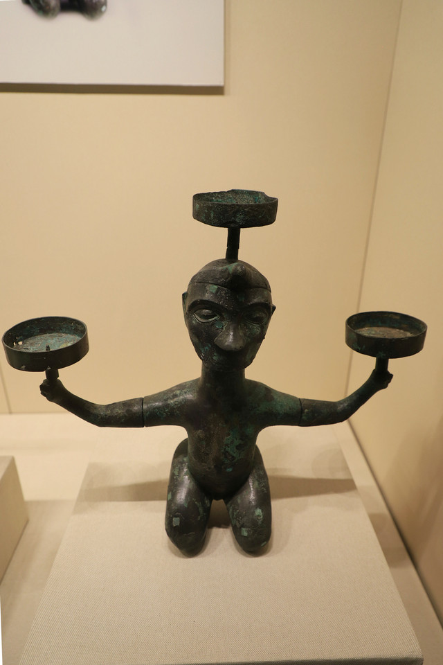 该器高42厘米,出土于个旧市黑蚂井。状如一裸体男俑跪坐,双手平伸,头顶、双手各有一灯盘。该俑灯分四部分拼合而成,手臂、头部均可与躯干分离,拼缝整齐、造型准确、线条流畅。俑灯虽为汉式题材,但跪俑形象却具有明显的地方民族特色,是汉文化与地方文化结合得较好的文物。
