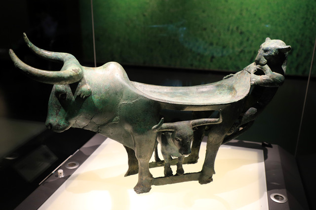 战国牛虎铜案,是云南青铜文化艺术的杰作,也是云南省博物馆的镇馆之宝。器物主体为一头大牛,站立状,牛角飞翘,背部自然下落成案,尾部饰一只缩小了比例的猛虎,虎做攀爬状,张口咬住牛尾;大牛腹下中空,横向套饰一只站立状小牛。