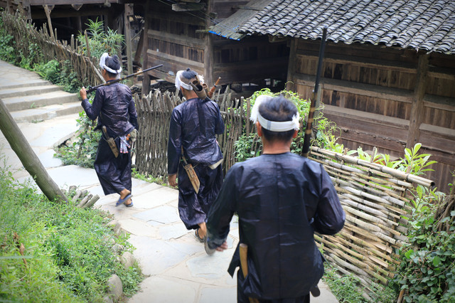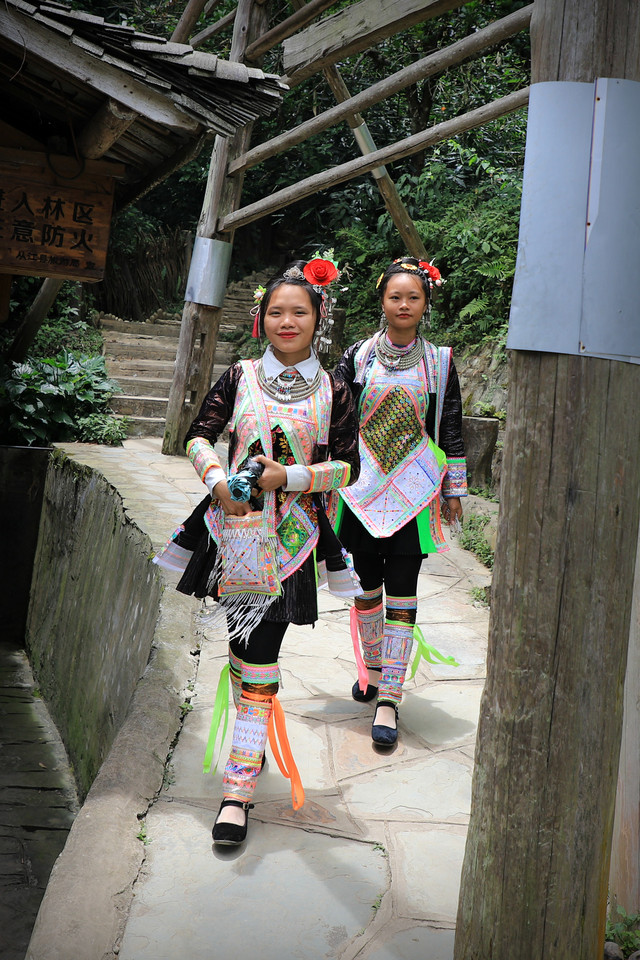 岜沙女性着装也极为精美,衣裙上古色古香的刺绣图案,配以银饰项圈、手镯,十分耀人眼目。