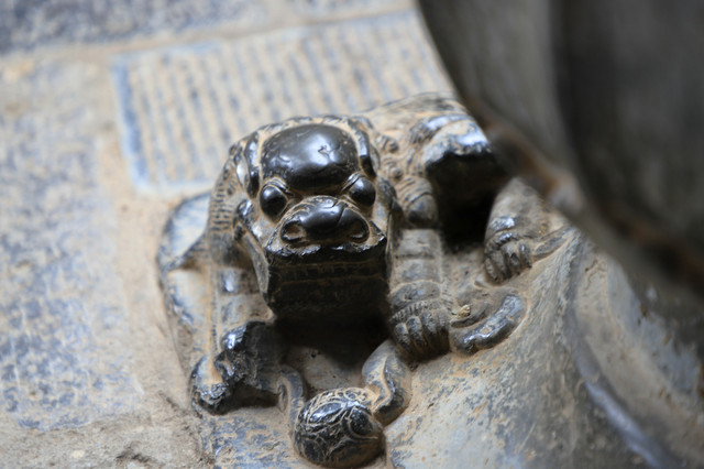 廊柱的底部,有四只石狮子围绕,呼应柱墩的圆形,故名为“狮子滚绣球”,石狮造型生动,惟妙惟肖