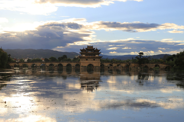 建水十七孔桥,俗称双龙桥,横跨在泸江和踏冲河交汇处,这座古桥建于清朝年间,一共有17孔相连,桥上还有三层楼阁,显得古老又很有气派。