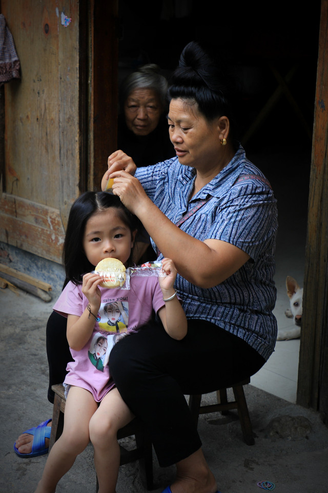 发髻在岜沙苗语中称为“户棍”,是男性装束中最重要的性别标志--剃掉男性头部四周大部分的头发,仅留下中部盘发为鬏髻,并终身保持这种发式,据说这种装束是从蚩尤老祖时代传下来的,也是迄今为止在中国所能见到最古老的男性发式。