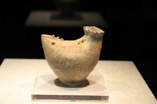 夹砂灰陶质地,身部戳印点线纹,背部和尾部饰贴塑乳丁纹,该壶形状似一只昂首翘尾的雄鸡,制作精致,构思奇妙,为云南新石器时代最具有代表性的陶器。