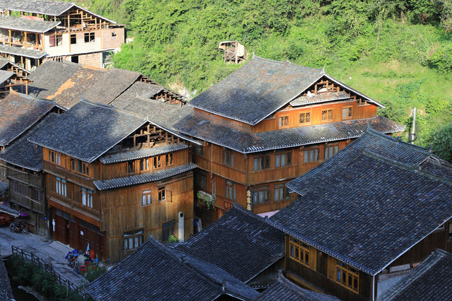 寨中房屋为干栏式吊脚楼,鳞次栉比,错落有致,全部用杉木建造,硬山顶覆小青瓦,古朴实用。