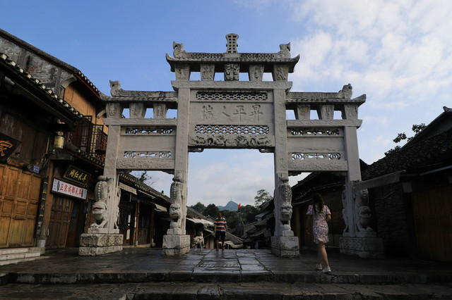 赵理伦百岁坊,距离广定门仅几步之遥,建于清道光二十三年(1843年),牌坊高9.5米,宽9米,呈四柱三间、三楼四阿顶式。由青岩本地石材“白绵石”所建,颜色洁白,历久弥新。四柱南北均有石狮护柱,狮高1.5米,前爪握宝,后爪壁于石柱之上,正中横梁上镂空雕“二龙抢宝”,北面正中刻有“升平人瑞”四字。牌坊没有基槽,靠4个长方形柱基直接立在地面上,一竖就是100年。