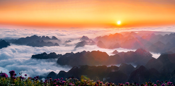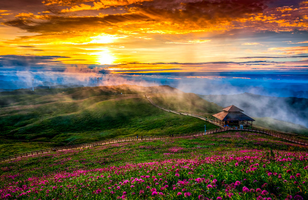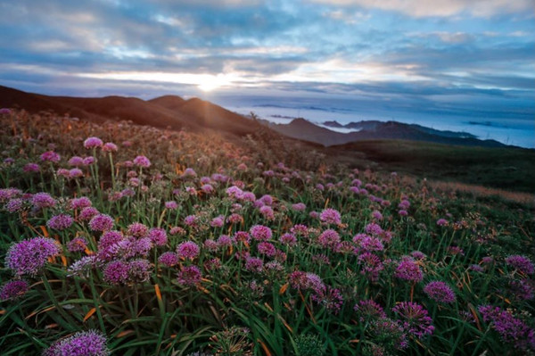 除了看花,韭菜坪还是登山、观云海、日出,赏漫天星空的好去处。站在山上,看层层云海涌动,日出后的韭菜坪在清晨的薄雾中一起一伏,与风车、高山、云海一同组成了一幅绝美的画卷。