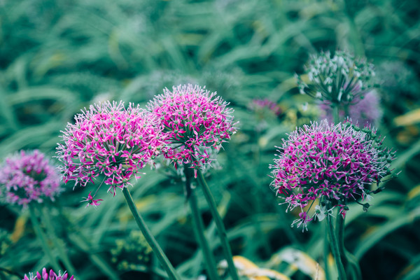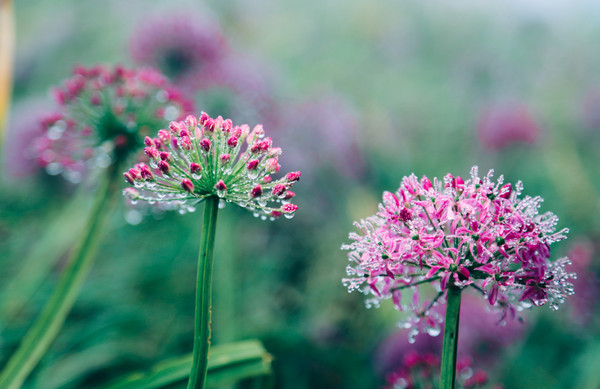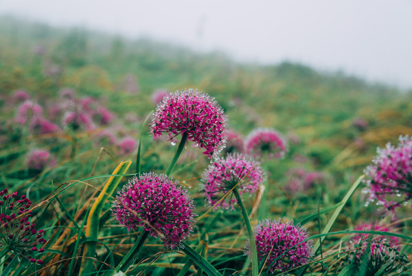沾了满身露珠的韭菜花,好似结了冰霜般晶莹。不管是近看还是远观,那些或淡紫或深紫的花朵,在山风的吹拂下总显得婀娜多姿,优美迷人。