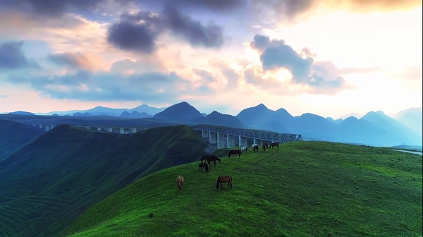 广阔苍莽的草原上,高处有黄牛和山羊,低处有悠闲散步的马群。碧草青青、山峦逶迤、牛羊成群嬉戏、凉风习习,一幅幅无与伦比的山水画面,简直让人猜不透到底是天上或是人间。