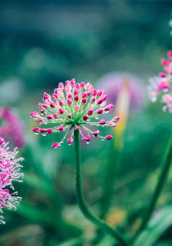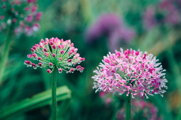 沾了满身露珠的韭菜花,好似结了冰霜般晶莹。不管是近看还是远观,那些或淡紫或深紫的花朵,在山风的吹拂下总显得婀娜多姿,优美迷人。