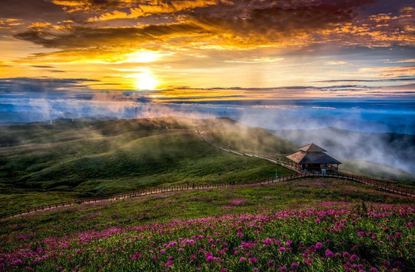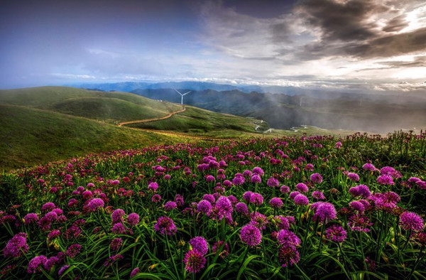 除了看花,韭菜坪还是登山、观云海、日出,赏漫天星空的好去处。站在山上,看层层云海涌动,日出后的韭菜坪在清晨的薄雾中一起一伏,与风车、高山、云海一同组成了一幅绝美的画卷。