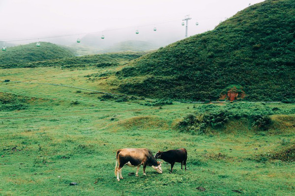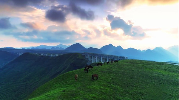 广阔苍莽的草原上,高处有黄牛和山羊,低处有悠闲散步的马群。碧草青青、山峦逶迤、牛羊成群嬉戏、凉风习习,一幅幅无与伦比的山水画面,简直让人猜不透到底是天上或是人间。
