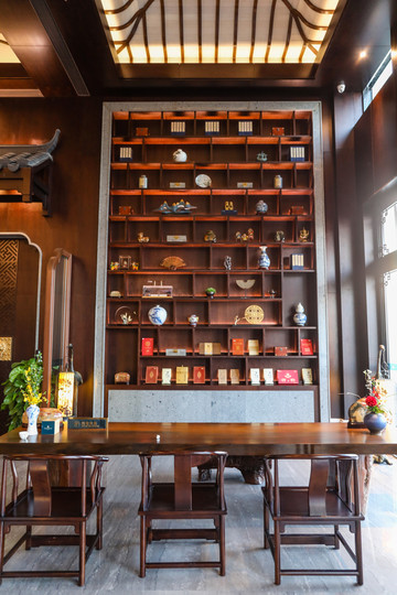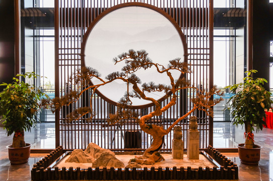 如果说这里最气派的,还是大堂中央那大片的水墨画屏风。大幅的屏风上,精致的水墨画上的山水栩栩如生,木架同样用了朱红的颜色,总有着一种蓬勃大气。