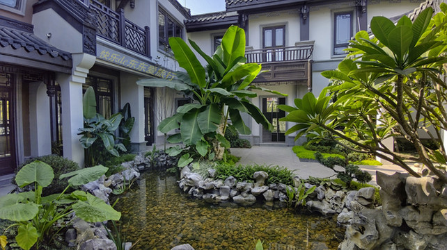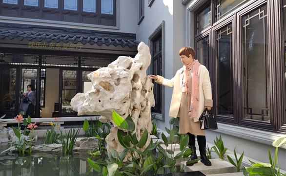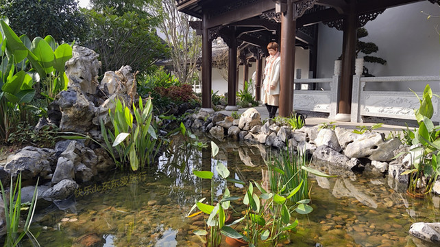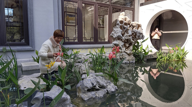 进了大门,我们来到一处院内的水池边,看到池内无规则地摆放了一些太湖石,太湖石的旁边种植了美人蕉等几种适合水里生长的观赏植物,唯美的搭配吸引了许多摄影师的目光。