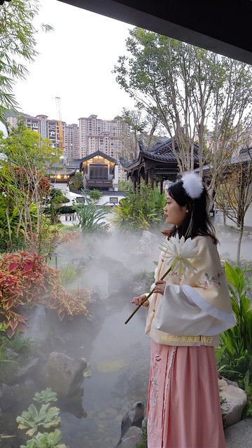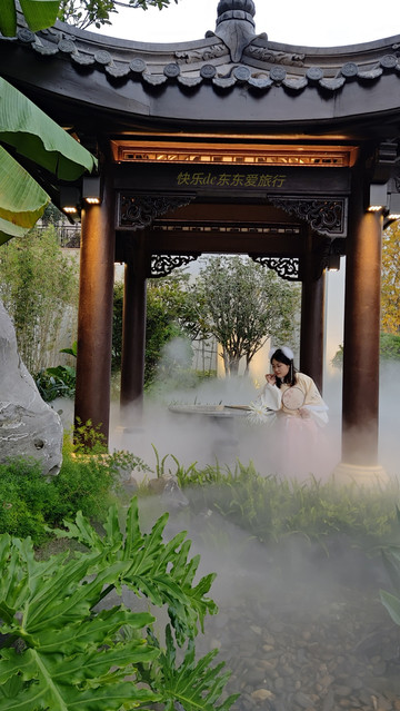 客家院子的第二个特色就是在花园里安装了许多喷雾设备,游客到来时,喷射出大量白色的水雾,与园林景观融为一体,营造出一种人间仙境的效果。