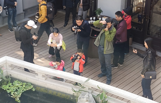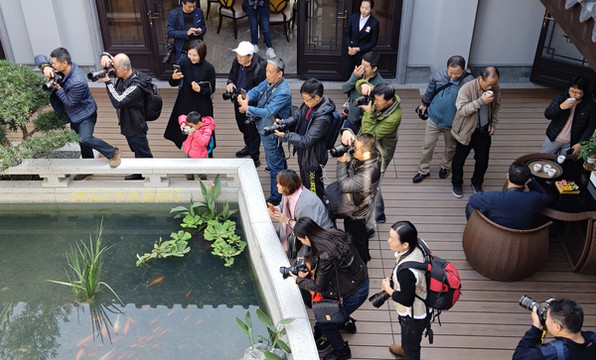 中式的会客室也很多人喜欢,你看,男女老少摄影师都把镜头对准这位泡茶的美女,搞得她不好意思地把头转向无人的地方,以避开大家锐利的目光。