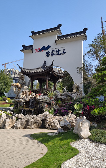 梅州客天下普育小学的背面往东走200米,就可以看到公路的另一边有一座假山和亭子,亭子上面的墙上写着“客家院子”四个大字。
