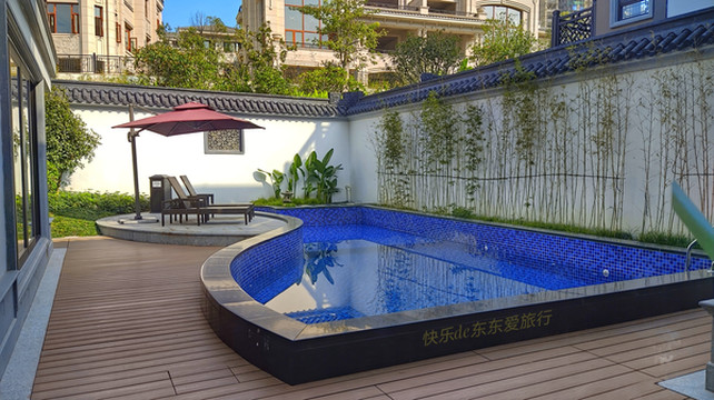 庭园的一个角落里,一个小巧的家庭式游泳池映入了我的眼帘。游泳池靠墙的一边种了一排细细的绿竹,靠墙的另一边则种了一丛芭蕉树。靠近房屋的一边,遮阳伞下摆放着两张带靠背的躺椅,很显然是给游累了的人休息用的。