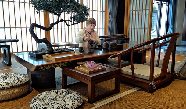日式会客间的茶几桌上摆放着一个盆景,若与文人雅士围在茶几桌旁,席地而坐,细细品味客家百年高山茶醇厚的清香,也不愧为人生一大快事!