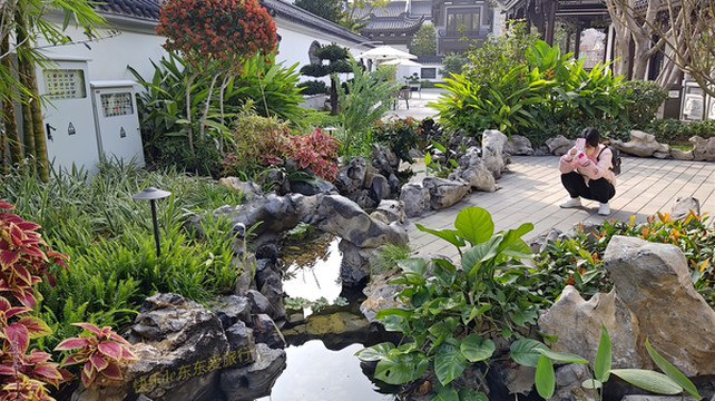客家院子外面的一处闲地上,有一座古色古香的亭子,亭子周围栽种有婀娜多姿的大型盆景树和红色叶子的巴西铁树及紫苏等植物,铁树旁边还有大型的深灰色太湖石,向游客透露了这里的景致与众不同。