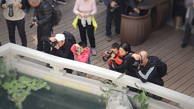 我记忆最深的是两个小小的摄影师手握单反相机在水池边专心拍照的情景,那姿势一点都不比专业摄影师逊色。看到这种情景,你有何感想呢?