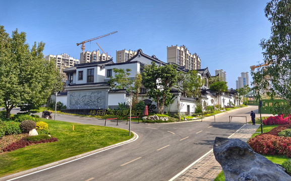 站在亭子里,你可以看到前面不远处绿树丛中隐隐约约的白墙黛瓦仿古建筑,这就是梅州客家院子。