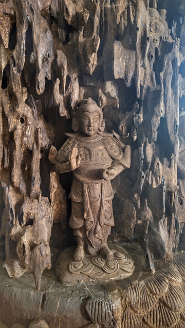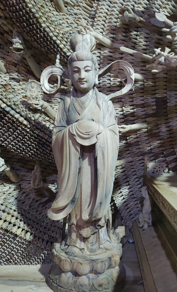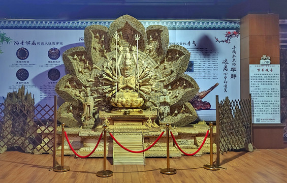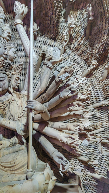 万手观音高3.91米,中心的正面是一位双手合十神态安详端坐在莲花台上的观音菩萨,其两侧和上面还有若干个略小的观音像,大观音的身体两侧伸出几十条真人大小的胳膊。