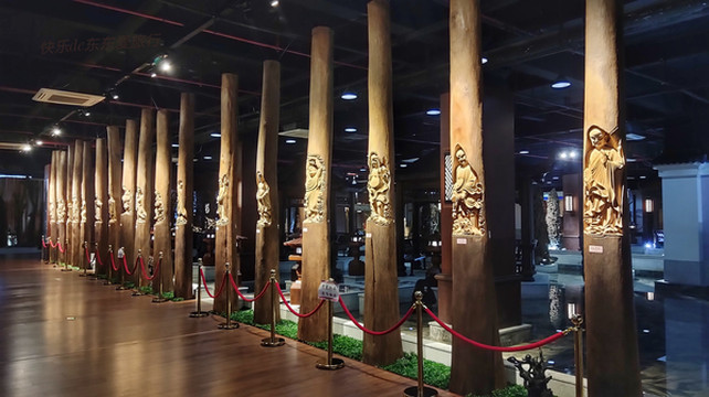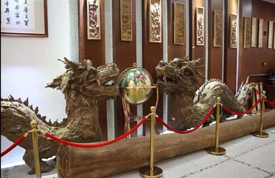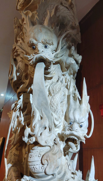 双龙戏珠:双龙戏珠木雕是博物馆内我比较喜欢的木雕作品之一,由越南进口的沉香原木雕刻而成的两条飞龙形象生动,龙头、龙身、龙尾活灵活现。两个龙头张开嘴巴欲将龙珠吞进口里,两排伶俐的牙齿分毫毕现;龙须自然下垂,一对眼睛轮廓分明,炯炯有神,一副抢不到龙珠誓不罢休的样子。