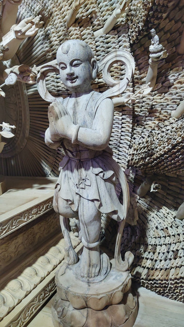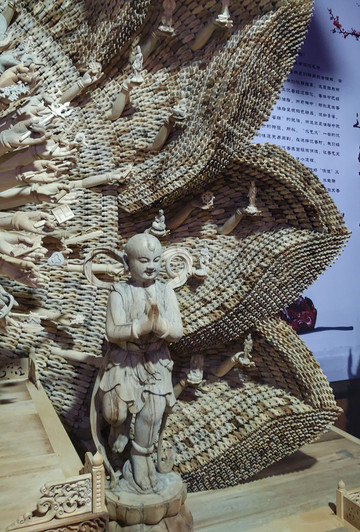莲台的两侧有一对神态虔诚的金童玉女,观音像的外围是数千个沉香雕刻的小手拼接而成的莲花花瓣。