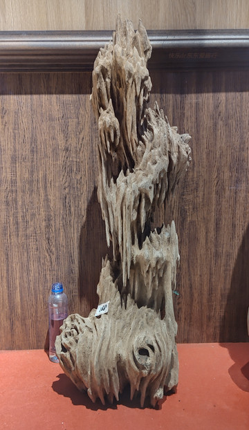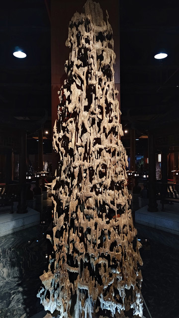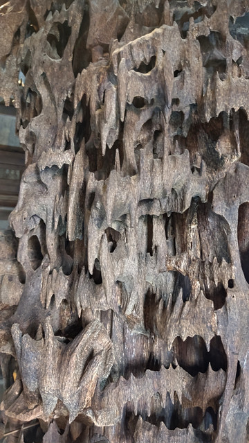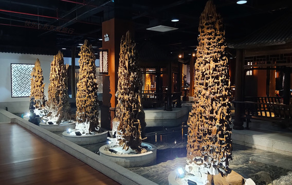 沉香博物馆内还有几排梁先生从越南收购来的塔状千年沉香原木,这些天然沉香塔是沉香树被雷劈、虫咬后分泌出沉香油脂,经过千年风化而形成镂空状态(也叫虫漏)。